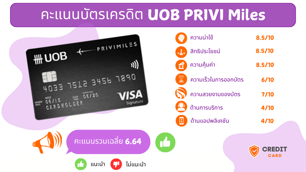 คะแนนรีวิวบัตรเครดิตยูโอบี พรีวิไมลส์ แต่ละด้าน คะแนนเฉลี่ยอยู่ 6.64/10 ถือว่าเป็นบัตรเครดิตที่แนะนำว่าควรมี